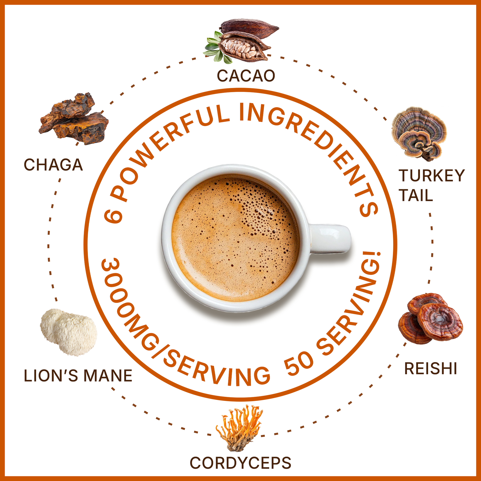 Lions Mane, Reishi, Chaga, Cordyceps, Turkey Tail, Cacao